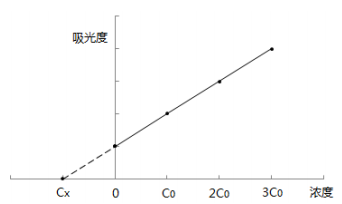 分別量取四份等量待測(cè)試樣(濃度為Cx),配制總體積相同的四份溶液。第一份不加標(biāo)準(zhǔn)溶液,第二、三、四份分別按比例加入不同濃度的標(biāo)準(zhǔn)溶液,四份溶液的濃度分別為:Cx、Cx+Co、Cx+2Co、Cx+3Co;加入標(biāo)準(zhǔn)溶液Co的濃度約等于0.5倍量的試樣濃度,即Co≈0.5Cx。用空白 溶液調(diào)零,在相同條件下依次測(cè)定四份溶液的吸光度。以吸光度為縱坐標(biāo),加入標(biāo)準(zhǔn)溶液的濃度為橫坐標(biāo),繪制校準(zhǔn)曲線,曲線反相延伸與橫坐標(biāo)的交點(diǎn)即為待測(cè)試樣的濃度。待測(cè)試樣濃度與對(duì)應(yīng)吸光度的關(guān)系見(jiàn)圖A.1。