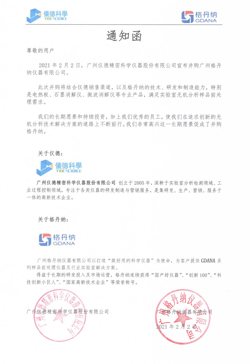 為進(jìn)一步促進(jìn)企業(yè)的發(fā)展,推動(dòng)公司并購(gòu)重組工作,茲廣州儀德精密科學(xué)儀器股份有限公司于2021年2月2日正式并購(gòu)廣州格丹納儀器有限公司,特此聲明。
