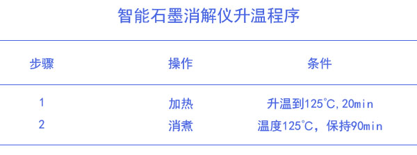 準(zhǔn)確量取0.25g(過100目篩)土壤樣品于50mL聚四氟乙烯消解管中,加入1mL硝酸溶液、1mL鹽酸溶液及2mL氫氟酸于消解儀中,同時蓋上蓋子,置于智能石墨消解儀的石墨孔中加熱消解,通過無線遠(yuǎn)程平板上的APP預(yù)先設(shè)置程序進(jìn)行消解(消解程序見下列表)。消解樣品程透明狀態(tài),開蓋,稍冷,然后定容至50mL。將得到的澄清液稀釋10倍作為液體樣品,待上機(jī)測定。同時做空白樣品試驗。